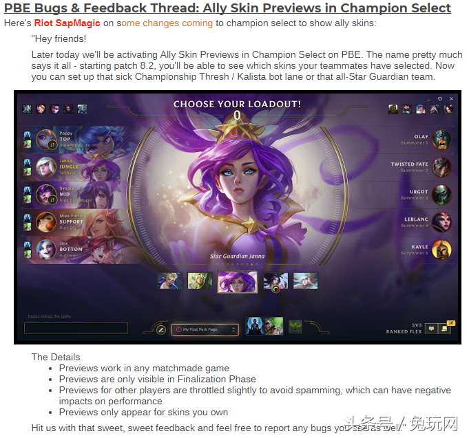 “今天晚些时候我们会在美测服开启向队友展示即将使用的皮肤的功能。正如这项功能的名字——从8.2版本开始,你将可以看到你队友选择了哪款皮肤。现在,你可以预设好锤石/卡莉斯塔的CP皮肤,或是星之守护者五人黑。”