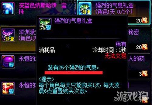 在魔界营地还有中央公园里的乔纳森NPC处可以选择购买,一袋礼袋有25个强烈的气息,一天最多可以买四个,也就是最多可以获得100个强烈的气息,一个礼袋价格10个精炼时空石。