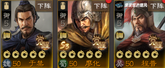 优先推荐选择于禁、程普、廖化,这三人都是5御,而且自带效果都很好,于禁群体加统率和免伤,廖化群体分摊且可以给自己加血,程普能削弱敌军属性。