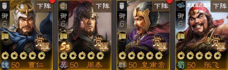 其次选择曹仁、周泰、皇甫嵩、张飞,这四人都是6御,容易跟输出抢御值,但自身战法效果都不错,曹仁群体抵御,周泰两条命,皇甫嵩自带援护,张飞能减低敌人对队友的伤害。如果实在没有这些武将再选用其他坦克。