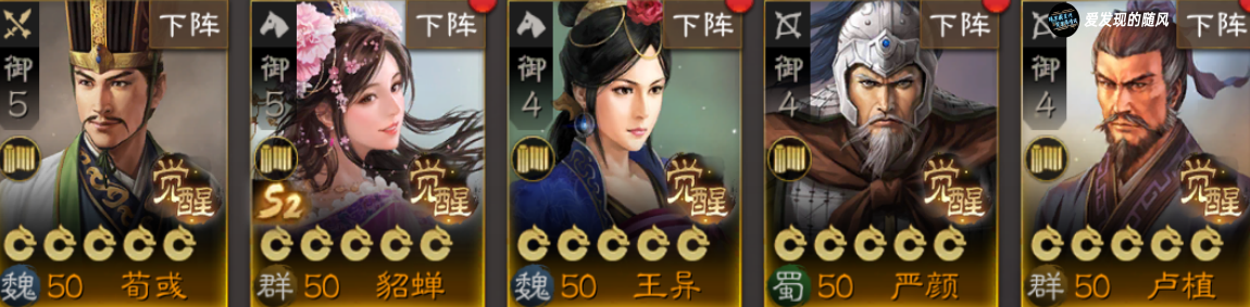 其次可以从荀彧、貂蝉、王异、严颜和卢植中挑选,荀彧能提供高额属性加成,貂蝉能使对手每回合自相残杀,王异能提供连击,严颜自带控制,卢植自带增伤。