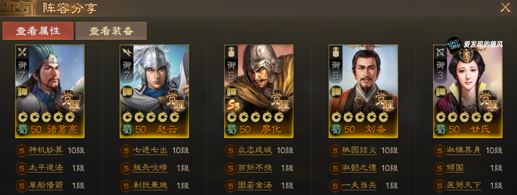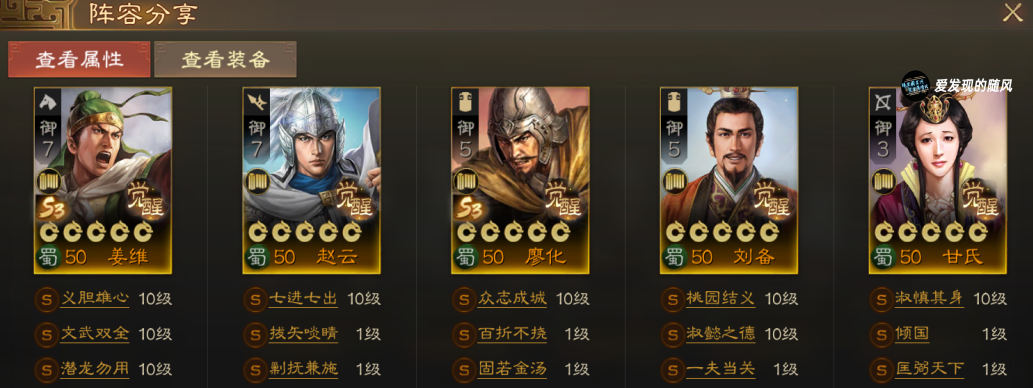 转型诸葛赵云廖化刘备姜维专用,只需要换一个将就能成型,如果没有抽到姜维,带关羽这套也是能玩的。诸葛赵云为输出,廖化保护队友,刘备牵赵云,甘氏在后方强奶。