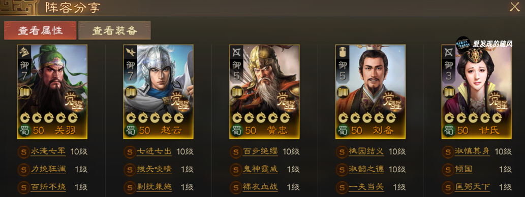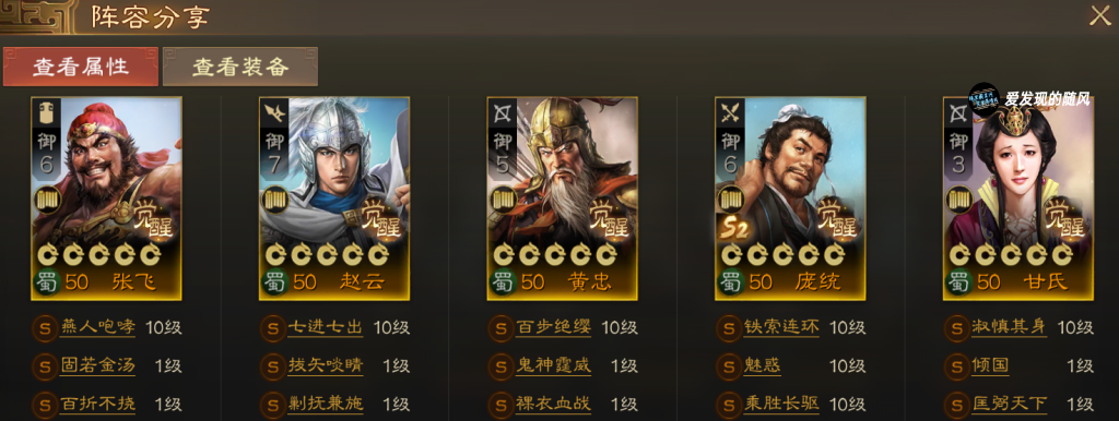 适合没抽到姜维转型桃园五虎或者老版蜀骑,关羽和赵云前排卡位输出,刘备和甘氏治疗,黄忠在后方输出。
