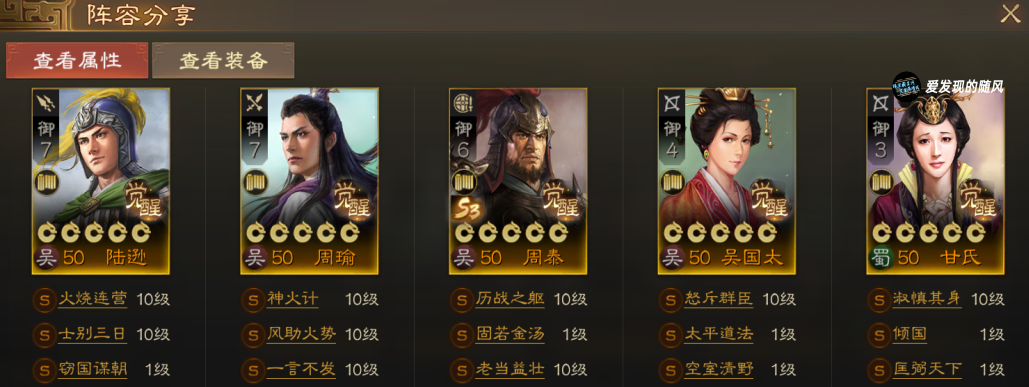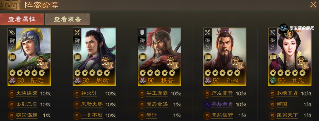 转型孙权周瑜陆逊周泰吕蒙火烧队,陆逊周瑜作为输出,陆逊的窃国谋朝和程普智计以及孙权自带战法形成属性差。没有窃国谋朝带百折也是可以的。甘氏治疗,这里也可以用蔡文姬,没有匡弼倾国可以用飞鸿羽翼、简亮、刮骨疗毒、淑懿之德等战法。