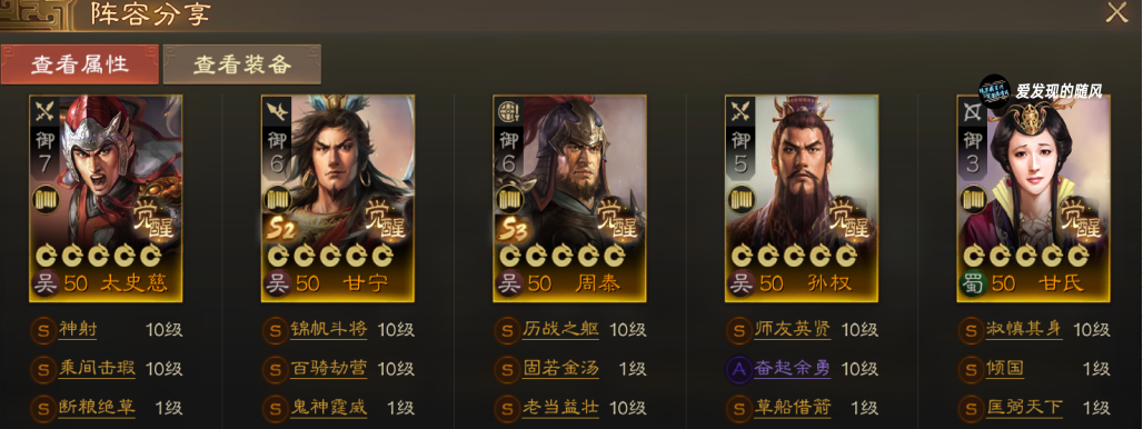 同样是转型孙权周瑜陆逊周泰吕蒙火烧队,利用周泰两条命的特性保护队友站住,周瑜、陆逊和吴国太快速AOE清理敌军,甘氏治疗。