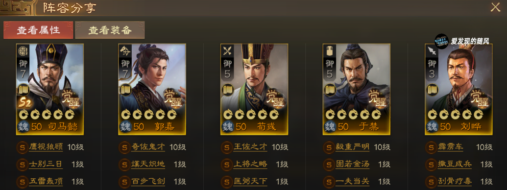 司马师的吸属性+智计+于禁一夫当关形成智力差和减伤,辅助司马懿和戏志才对敌军造成高额伤害。于禁保护队友,甄氏治疗。可转司马懿司马师于禁荀彧郭嘉。