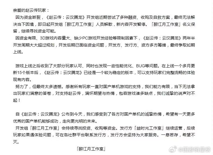 因为资金断裂,《赵云传:云汉腾龙》开发组近期尝试了多种融资、收购及自救方案,最终无法解决当下困境,即日起开发组「醉江月工作室」人员解散,新内容开发暂停。「醉江月工作室」名义保留,继续寻找资金可能。