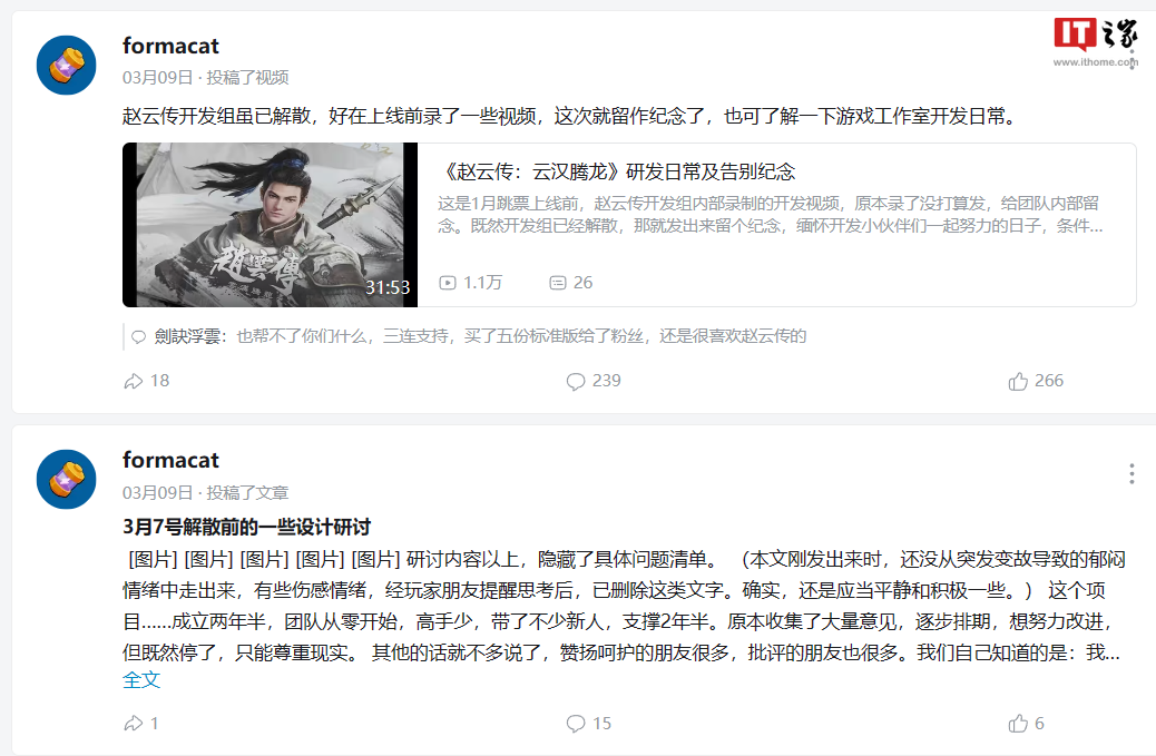 醉江月工作室游戏制作人formacat 也发布消息确认解散,并晒出 3 月 7 日解散前的一些设计研讨和告别纪念视频。