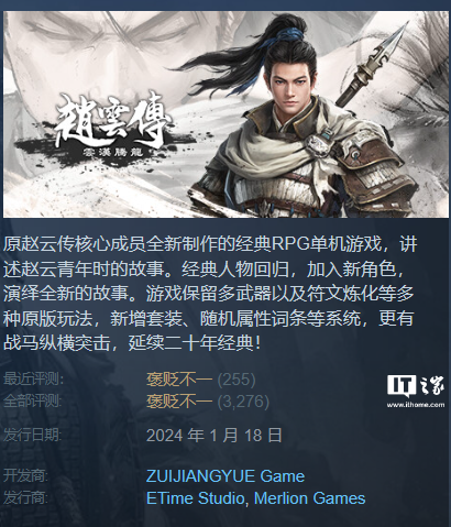 国产动作 RPG 单机游戏《赵云传:云汉腾龙(赵云传重制版)》此前已上线 Steam,这款游戏由原《三国赵云传》核心团队成员制作,采用买断制,于今年 1 月发售。
