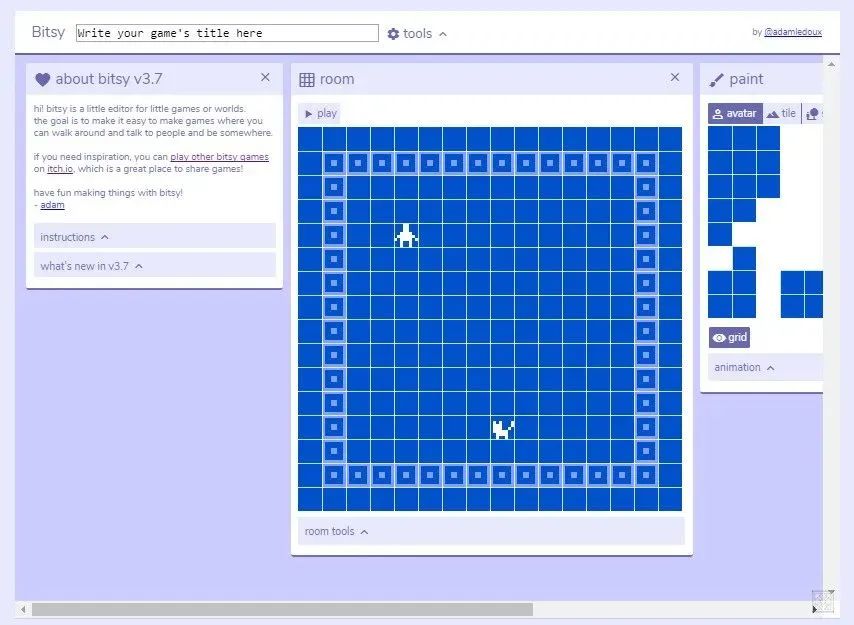 https://ledoux.itch.io/bitsy 来直接使用它(这个链接更直接 https://make.bitsy.org/)。