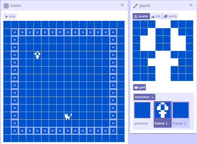 现在点击“动画”(animation),你的人物就开始闪烁了。开始画你的第一个 2 帧 Bitsy 动画吧。