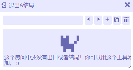 点击房间板块底部的“退出&结局”(exits and ending),然后在新出现的面板上点击“+”。你可以选择想要添加的出口类型:双向的“退出”,单向的“one-way exit”,还有“结局”。然后你可以看到双向传送门的位置。
