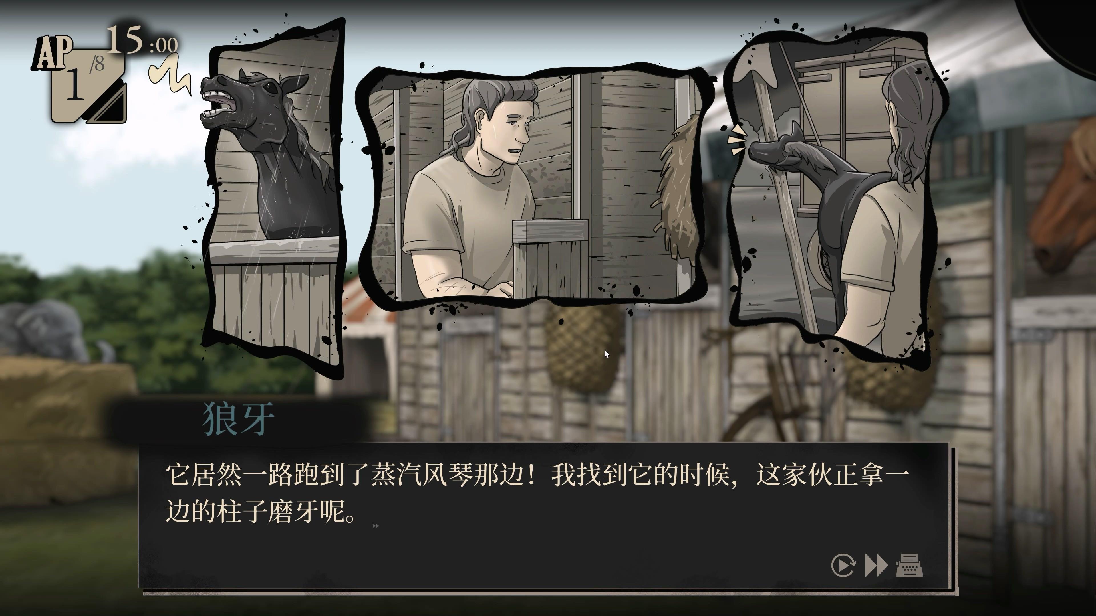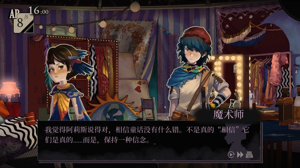 不过,《双盲把戏》在NPC的刻画上做得还是比较优秀的。在四处调查时,你可以看到每位NPC都在以自己的方式过着马戏团成员的一天,无论人偶师、弄火人、驯兽师、还是小丑,游戏对他们的描写都十分细致,也颇为生动。而且,在大量出示证物的环节中,你也可以顺便了解到那几位马戏团成员的过往,或是彼此之间的恩怨纠葛,从而进一步深入了解他们每个人。