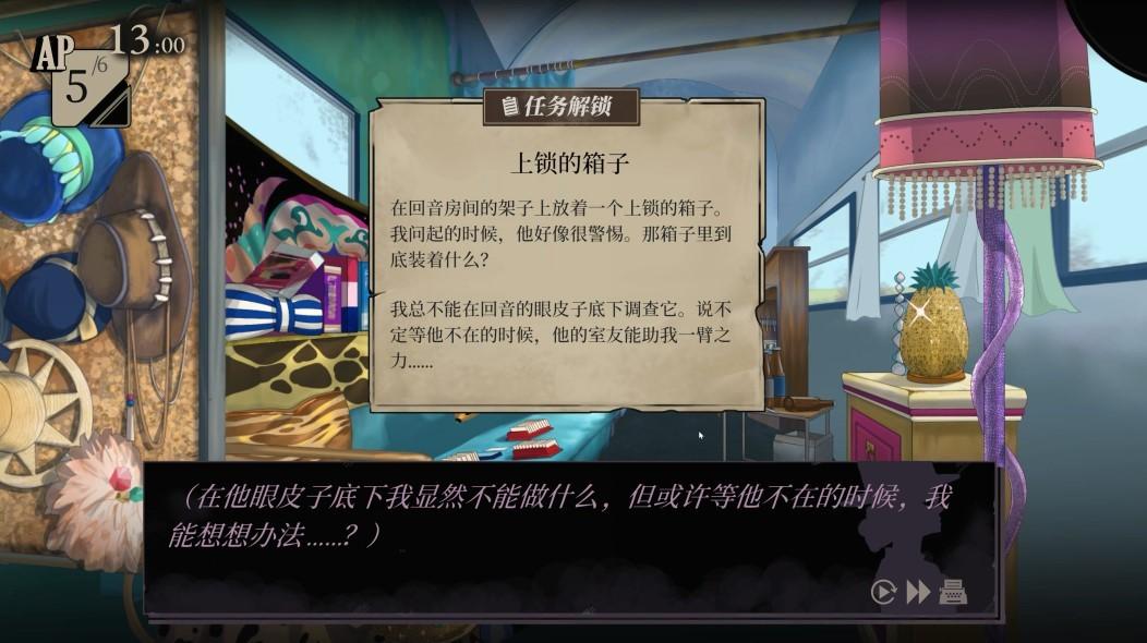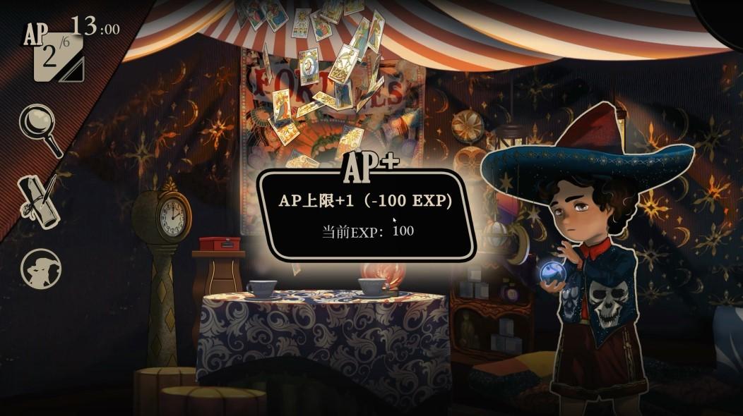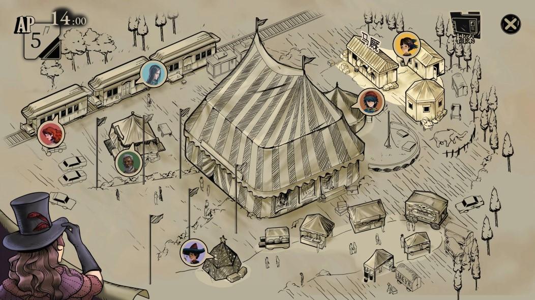 这个设计理念带有一定的桌游风格:在每个1小时的时间段内,你都可以在大地图上,自由选择前往马戏团中何处进行调查。而无论移动、调查场景、还是向他人出示证物,都需要消耗一点行动力(AP)点数,当你的行动力耗尽,视角便会切换到另一位调查员,由他来在这1小时内进行探索。若是两人都探索过,那么便会推进到下个时间段。