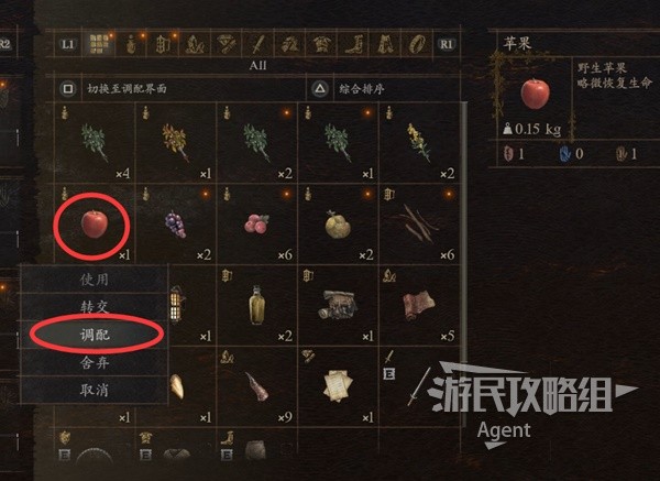 在物品栏选中一项物品,可以看到“调配”菜单。