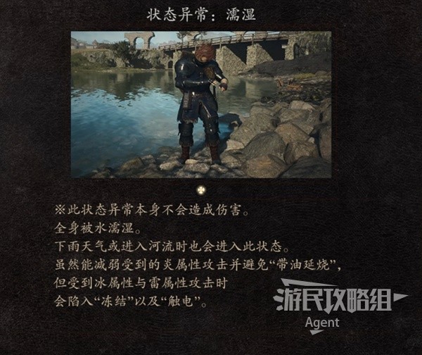 下雨天气或者进入水中,身体被浸湿后,可以减弱受到的火属性攻击,但是受到冰属性攻击会冻结,受到雷属性攻击会触电。