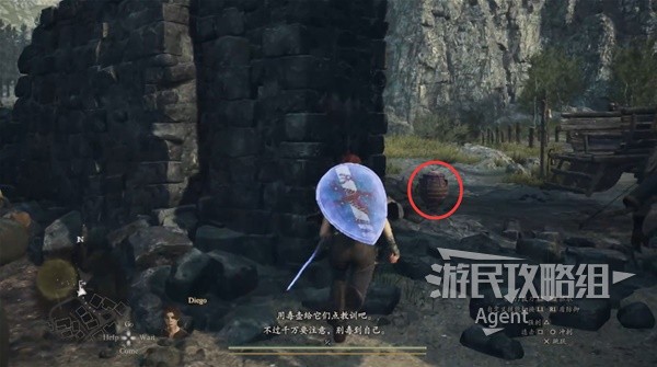 到村口外,找到火药桶。抱起火药桶,扔向河对岸蜥蜴人的巢穴。