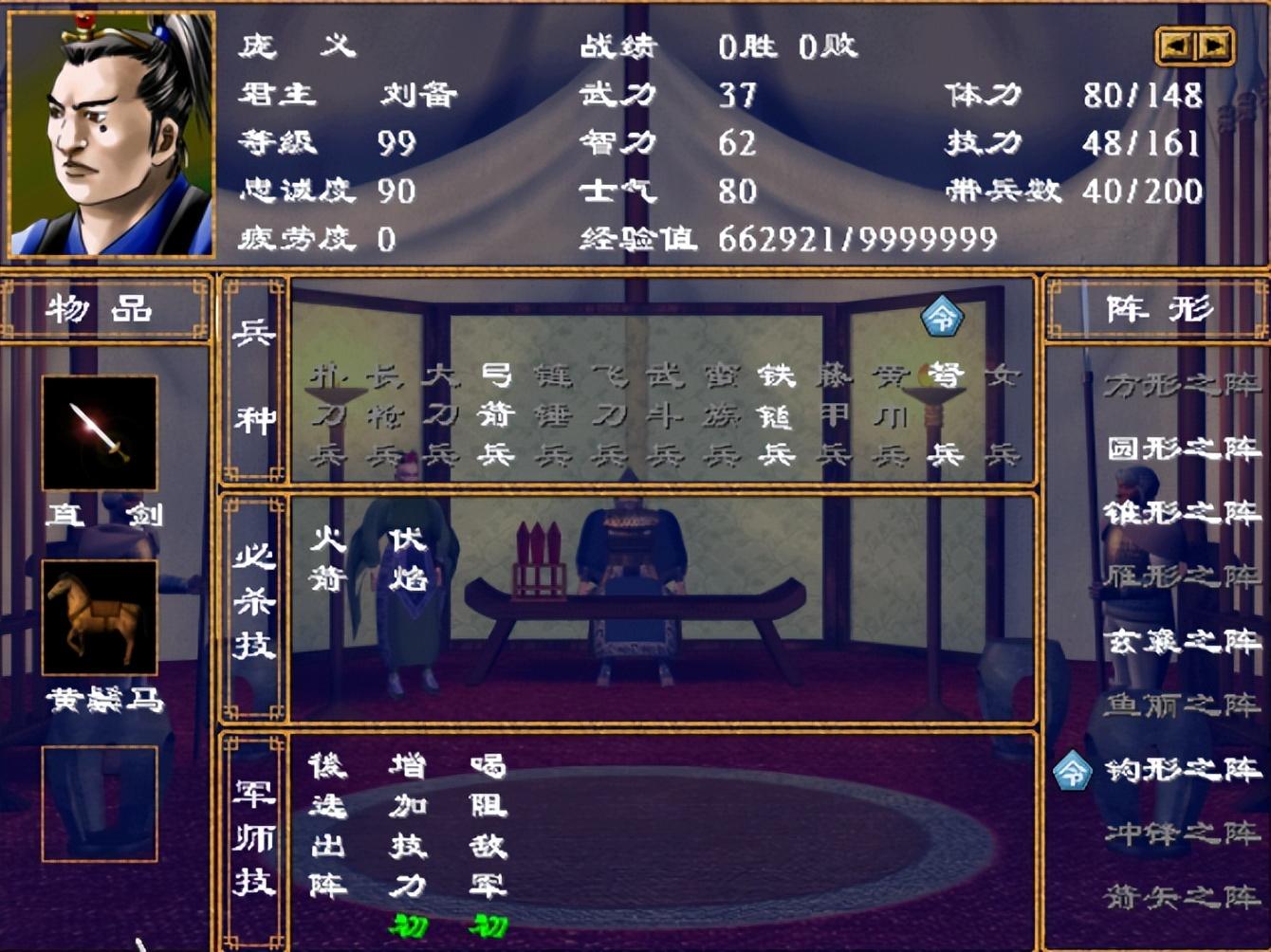 庞义的武力36,智力62,武将技只有火箭和伏焰两个,军师倒是技有三个,但也只有增加技力(初)还说得过去。不过他的头像实在太不讨喜了,尤其是眼角下的那颗大痦子,让他加入岂不是拉低了我军的颜值?还是砍了吧。