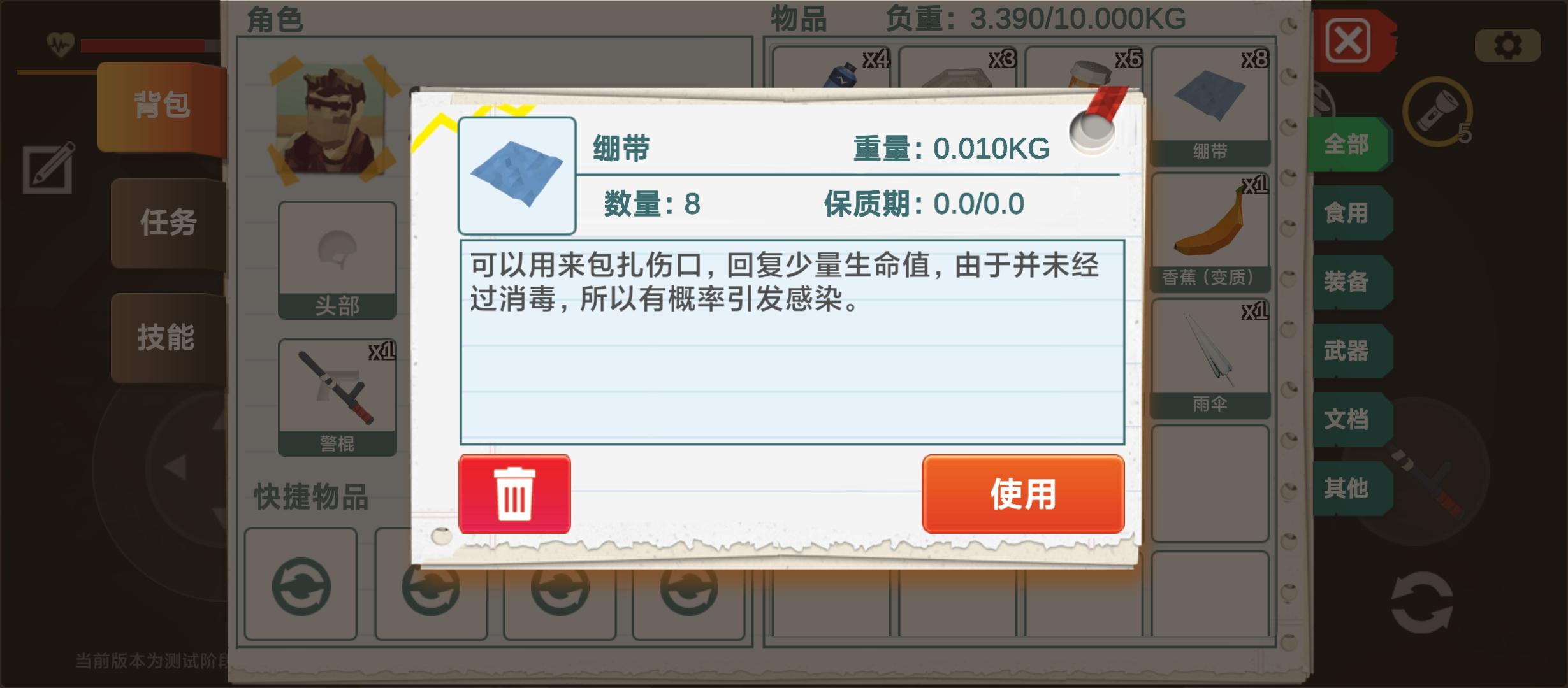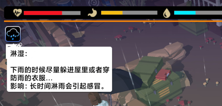 在真实求生过程中,我们也要时刻注意可能引发身体负面状态的要素,像是不干净的水源、变质的食物、可能出现的猛兽甚至是身上超出负荷的重物等等。也要具备基础的药理知识,以应对各种负面状况。