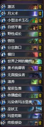 这套卡组可以说是一套不折不扣的控制卡组。控制卡组要满足几个条件,第一要有足够的奶牌和解场牌,第二要有制胜手段。这套卡组中满配了德鲁伊的解场牌,当然对于传播瘟疫来说,也可以算作一张解场牌,而且卡组中的分岔路口等一些牌都能够作为回血牌,来补充血量。