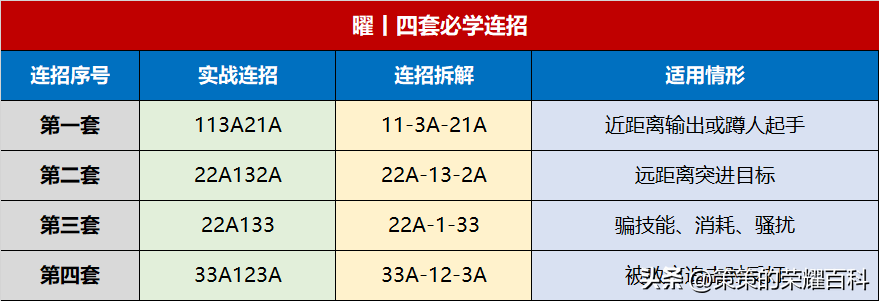 曜22A起手,进行远距突进;13消耗的同时,拉回身位;最后,刷新被动,再接2A跟进伤害收割。
