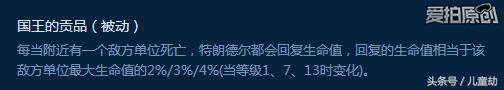 解析:被动是巨魔能够横行线上的主要原因,他大大增加了巨魔在对线和团战的续航能力,只要周围有敌方单位死亡,就能回复敌方最大生命值的百分比,使巨魔能够持续不断的获得血量从而在对拼中取得优势。我们都知道,巨魔是越战越勇的最佳代表。而被动就是在对线期间的完美证明,配合W技能使用更佳。但是如果对线爆发能力强的上单,尤其是打一套就走的,最好不要依靠被动的续航去打消耗。一定要等其关键技能释放之后在去对拼,这样会更加稳。