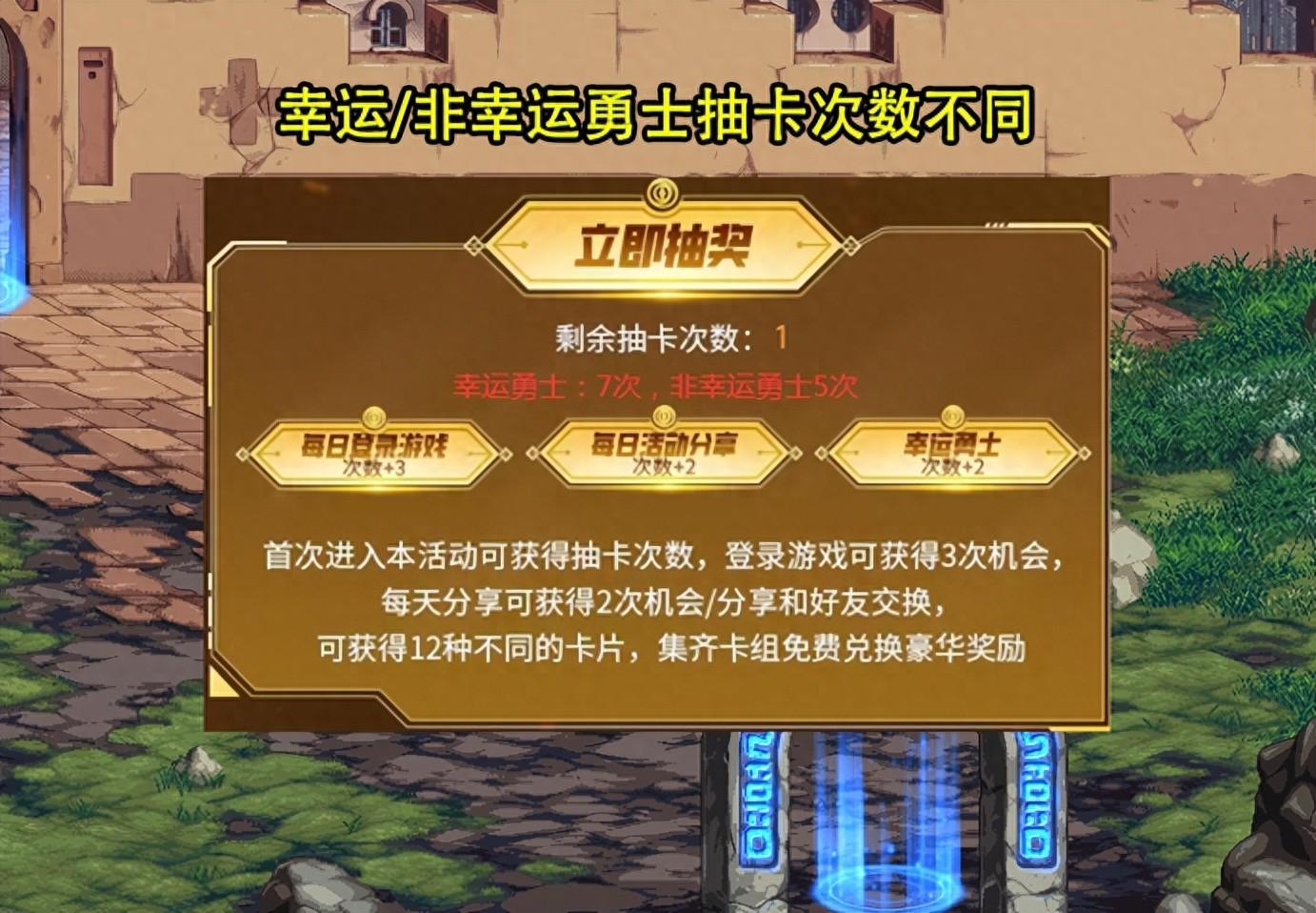 首先,该活动名为DNF雾神的记忆,是集卡活动!在活动期间,玩家可通过每日登入游戏、分享活动,以及是否是幸运勇士来获得抽卡次数,如果不是幸运勇士,每天可获得5次抽卡次数,是则可以获得7次。