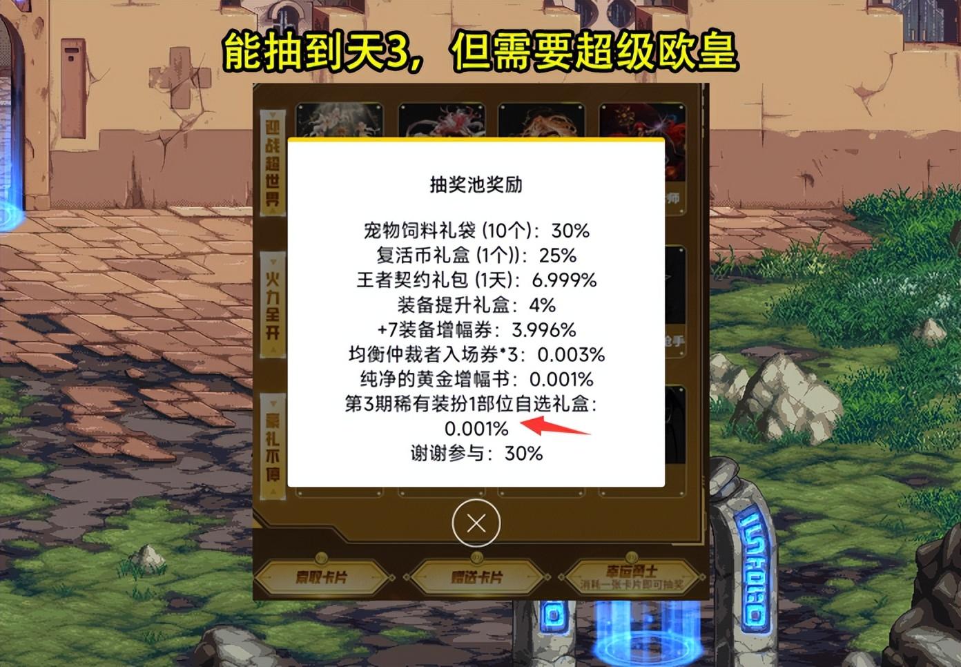 卡片组总共有三种,分别是迎战超世界、火力全开,以及豪礼不停!如果玩家把卡片组的奖励兑换完了,则可以把剩余的卡片进行抽奖,总共可抽取的道具有8种,其中抽奖道具能称得上给力的有黄金增幅书,以及天3一部位自选礼盒,不过概率比较低,两个都是0.001%,能抽到的绝对是欧皇中的欧皇。
