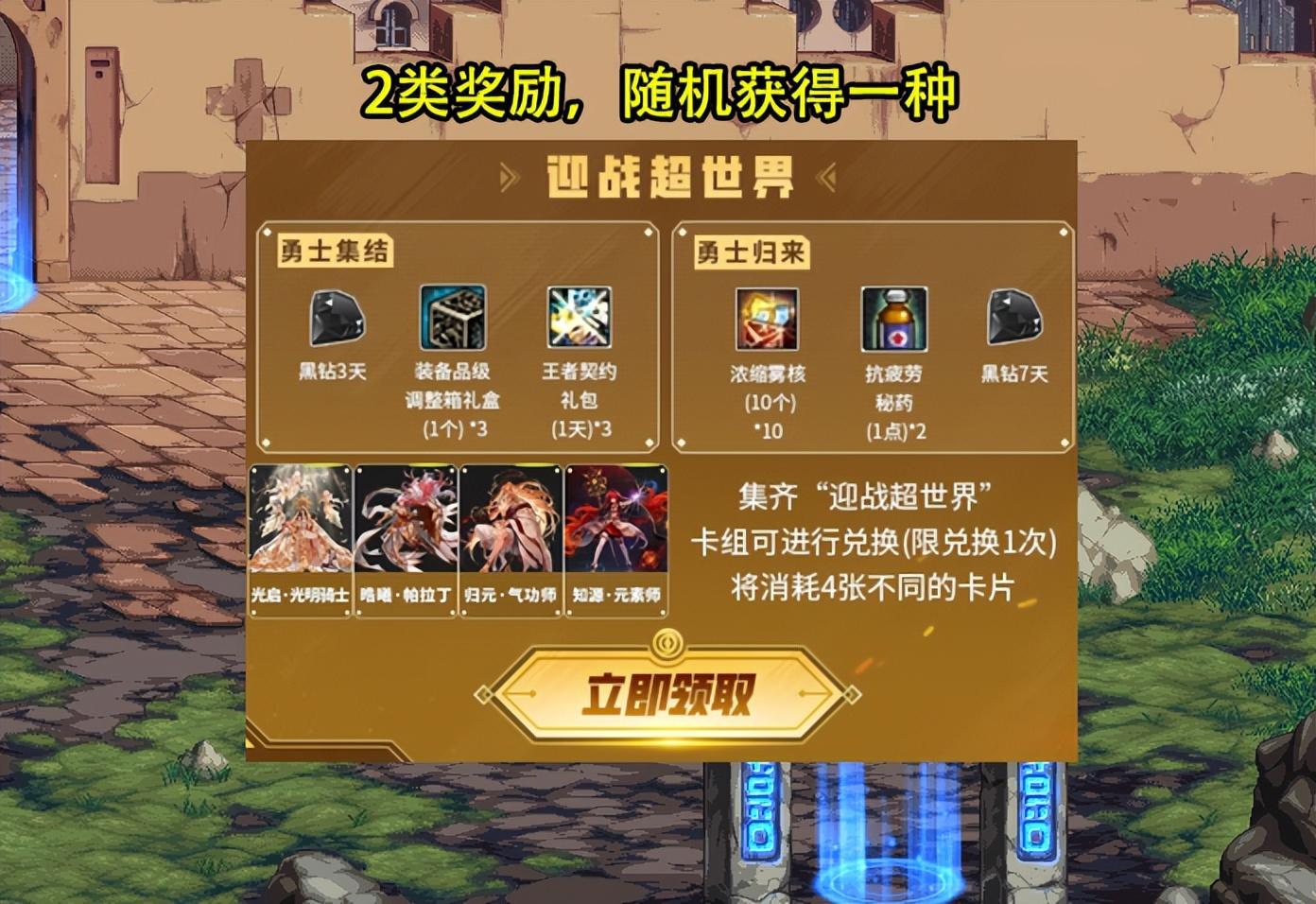卡片组奖励方面,迎战超世界卡片组可在勇士集结,以及勇士归来礼包里随机获得一种!其中勇士归来的黑钻天数比较多,会更好一些,不过参与过卡片活动的玩家都知道,勇士归来卡片组,大概率只有回归玩家才能获得。