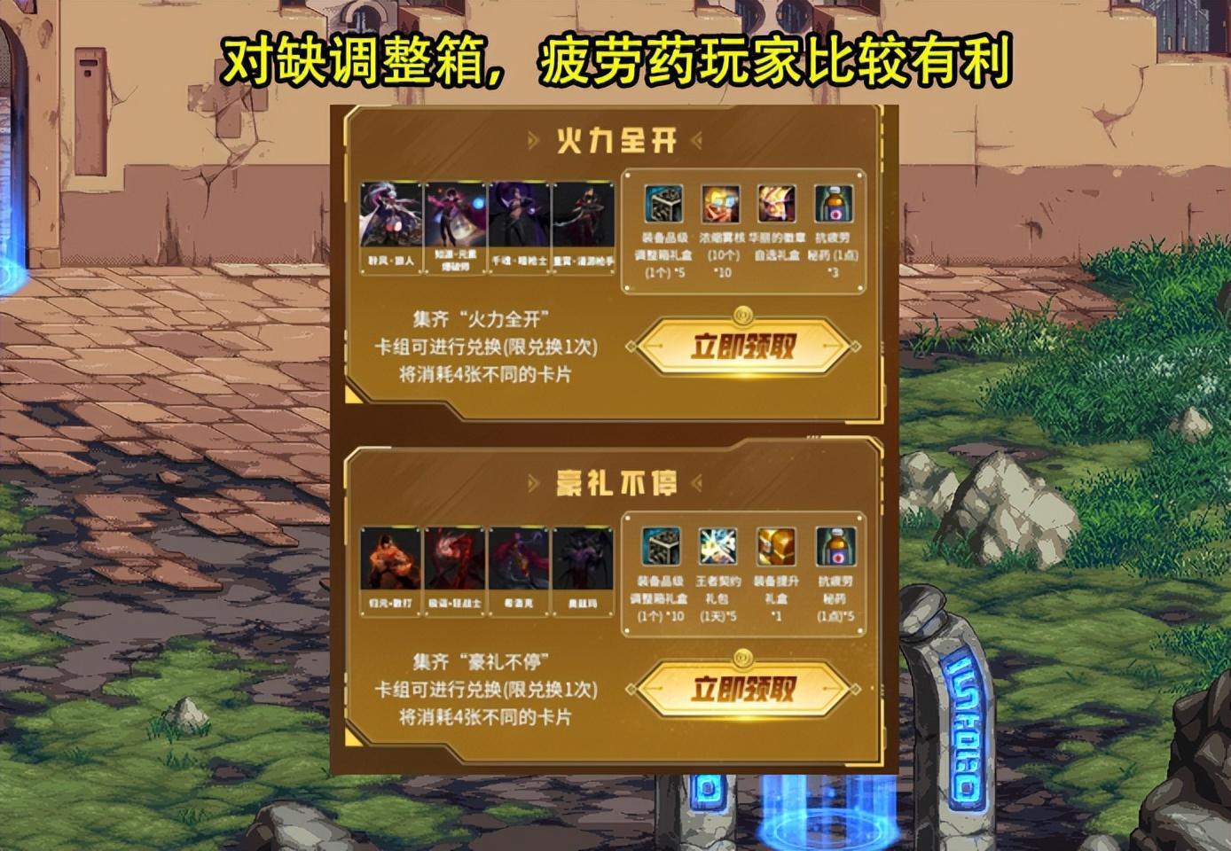 火力全开卡片组和豪礼卡片组也比较一般,一个可拿5个调整箱100个账绑雾核、1个华丽自选礼盒,3点1点疲劳药,一个是10个调整箱,5天王者礼包契约,1个增幅器,5瓶一点疲劳药,对缺调整箱,需要刷深渊的玩家比较有利。
