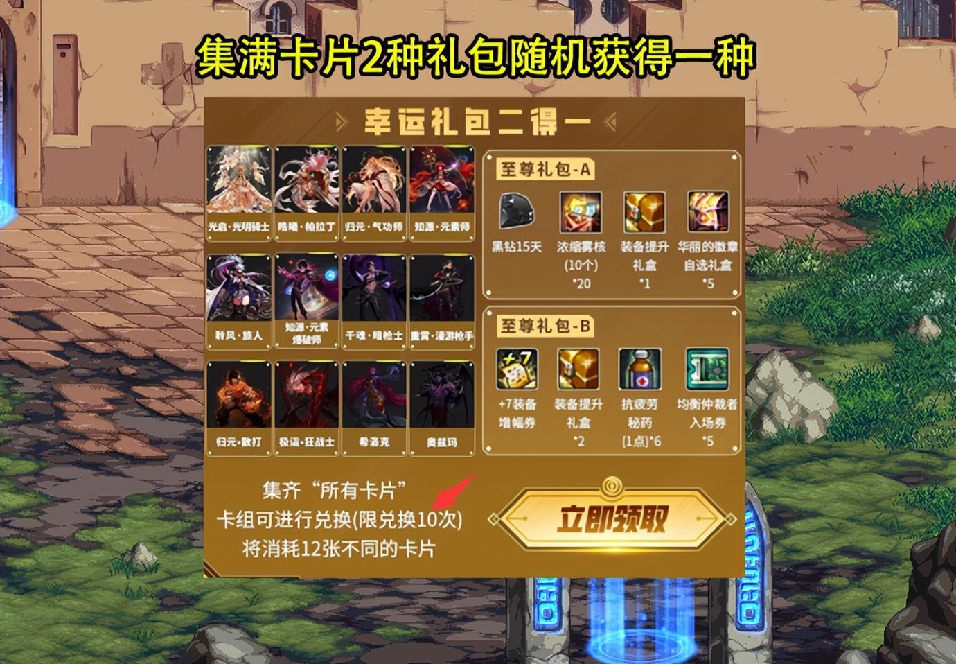 最后,就是全部卡片组兑换的幸运礼包二得一奖励了,这个奖励是本次活动的核心,玩家在凑齐12张卡片后,可在至尊A礼包,以及至尊B礼盒获得一种,最高可获得10次,其中B礼包好一点,因为有+7增幅券,2个增幅器。