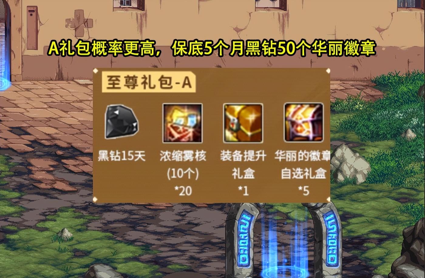 不过A礼包其实也不错,参与过的玩家都知道,A礼包抽到概率更高,如果都抽到A礼包的话,那么可以获得150天黑钻、2000个账绑雾核,10个增幅器,以及50个华丽徽章,对于黑钻天数少,以及合灿烂徽章还是挺不错的。