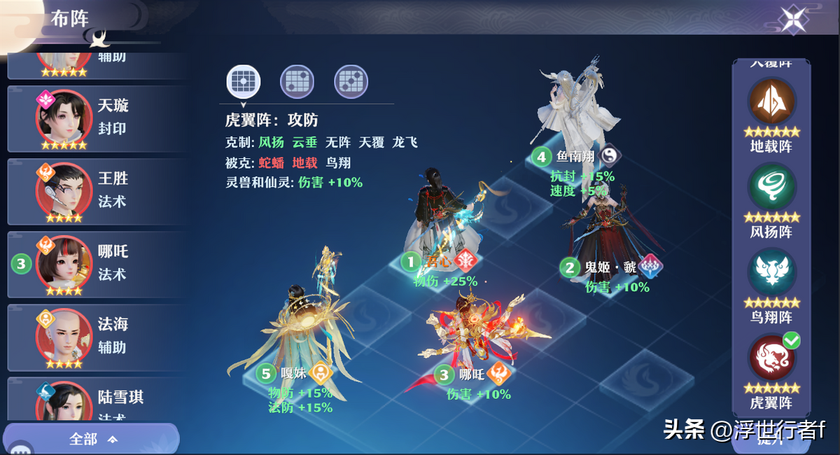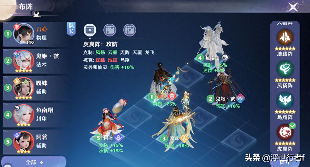推荐使用虎翼阵,鱼南翔站在抗封位,禅音/锦鲤儿和鬼姬站在伤害位,鬼王角色站在物伤位,阿箬/禅音站在防御位。