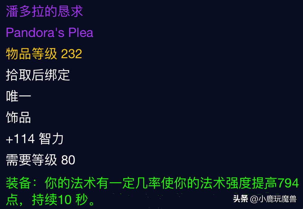 第一件:潘多拉的恳求。这是一件法系职业的饰品,至于它好不好,我们得先看一下它的属性,白字直接给到了一个114点的智力,绿字属性是一个触发特效,触发后可以获得794点法强,持续10秒,触发机率只有百分之十,并且还有45秒的内置CD,它的这个触发特效对于治疗来说就是废物属性,就算是奶骑使用也是一般般,因为治疗职业主动特效的价值远比被动特效可靠,毕竟绝大部分压榨治疗的BOSS都存在时间轴机制,而主动饰品在这个时候的价值远远高于被动饰品。