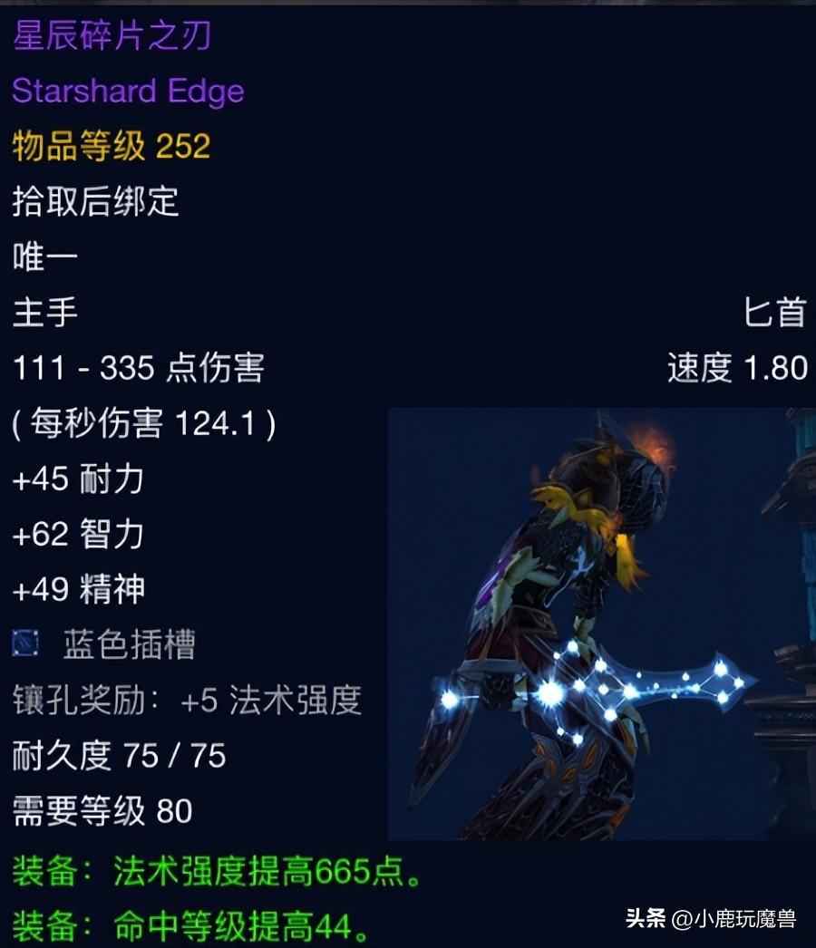 第二件:星辰碎片之刃。这是一把法系DPS得匕首,我们先来看看它的属性,白字属性是三系开花,加了45点的超低耐力和高额的62点智力以及49点精神,DPS看到这样的属性难道不喜欢吗,随后又给到了一个蓝色宝石孔,绿字属性则是665点法强以及44点命中,它的属性和数值方面都非常的不错,就是感觉44点的命中有点拖累了这把法匕的整体实力,不管怎么说,这把法匕算是极品吧,外观加属性的双重完美结合,毕竟帅是一辈子的事情。