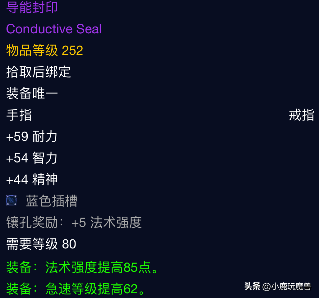 第三件:导能封印。这是一件法系戒指,也是P2阶段毕业戒指之一,我们来看看它的属性,白字方面加了59点的耐力和54点智力以及44精神,随后又给到了一个蓝色宝石孔,绿字属性则是85点这个阶段杵到顶的法强和62点的高急速,这属性绝对能让各大法系职业抢破头,它和星云戒指搭配就是某些职业整个P2阶段的最强组合,甚至在P3阶段都没有可以顶替他的戒指。
