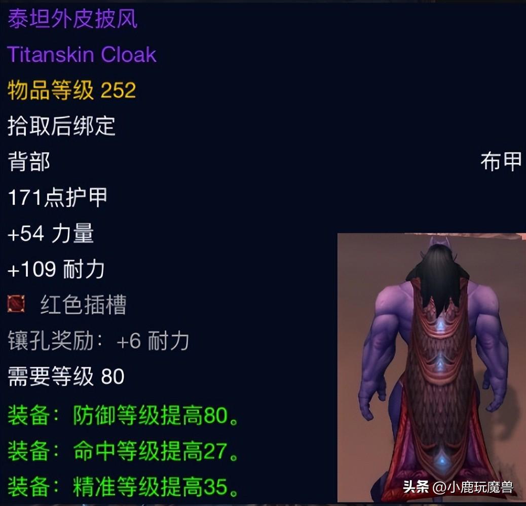 第四件:泰坦外皮披风。这是一件超极品的坦克披风,我们先来欣赏一下它的极品属性吧,白字属性给到了54点的力量来提升仇恨和109超高的耐力来保证近战的血线健康,并且一个红色宝石孔,绿字属性则是80点超额的防等和27点的命中以及35的一个精准,这属性对于大部份25人的主副坦来说,这是陪伴你最长时间的仇恨向披风了,因为它横跨了整个P2阶段以及P3阶段,因为258箱子出得披风是生存向的,所以就不难发现,这件披风也是非常保值的。