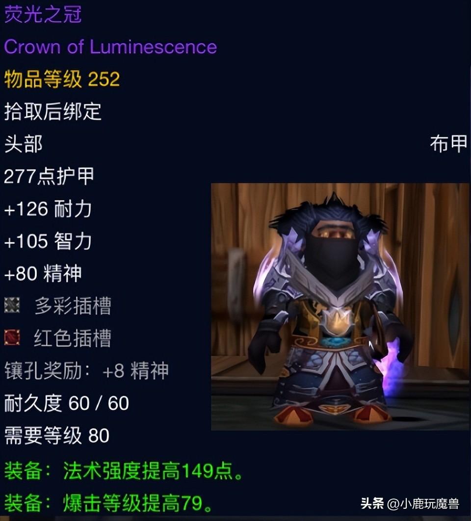 第五件:荧光之冠。这是一件超极品的法系布甲头,它的白字属性加了126点的耐力和105的智力以及80点精神,它这三个属性的属值都是杵到顶的,随后给到了一个多彩一个红色两个宝石孔,绿字属性则是149点法强和79点暴击,这属性够极品吧,只要是吃暴击的职业,毫无疑问这个就是毕业了。如果要说米米尔隆掉落最强的法系装备,只有前面的那枚戒指和这件布甲头,星辰法匕都拉了一点。