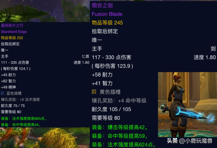 第六件:融合之剑。这是法系职业P2阶段的次级毕业武器,拿不到星辰法匕,它就是毕业了,我们来看一下它的属性,白字属性是58的耐力和41的智力,一个黄色宝石孔,绿字属性则是42点的暴击和59的命中以及624的法强,我们对比一下他们两个的属性,融合之剑的整体属性要比星辰要弱一些,小鹿也不知道为什么米米尔隆掉落的两把法系武器都加命中,真的是一大缺陷。