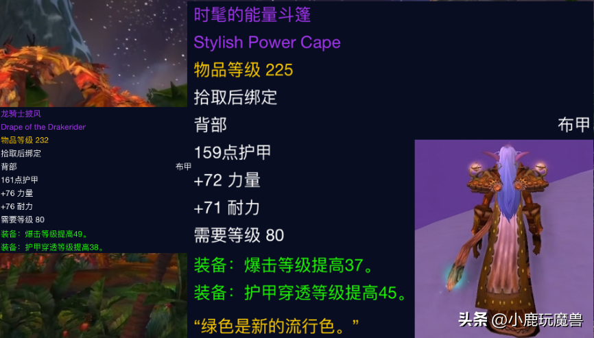 第七件:时髦的能量斗篷。这件披风说极品也极品,说不极品也不极品,我们还是来看看它的属性吧,白字属性加了72点的力量和71点的耐力,绿字属性则是暴击37点和45点护甲穿透,属性看起来数值不怎么高,但是狂暴战用这件披风比25人锋鳞掉落的龙骑士披风跑分还高,可以说这件披风是真的神了,可能护甲穿透的价值高于暴击吧。