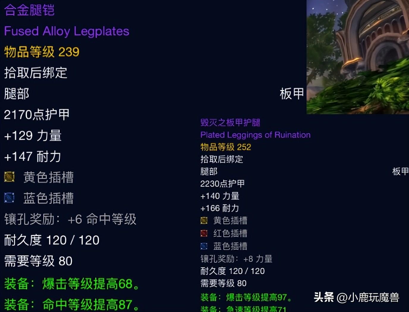 第八件:合金退铠。这是一件有争议的板甲裤子,我们来看看它的属性,白字加了129点的力量和147点的耐力,一黄一蓝两个宝石孔,绿字属性则是68点暴击和87点的高命中,这属性看起来确实比252的急速裤子差很多,但是你要看给谁穿的,比如冰DK这个职业,他就对急速属性需求不大,所以这条裤子在冰DK眼中跟252的急速裤子的价值是一样的。
