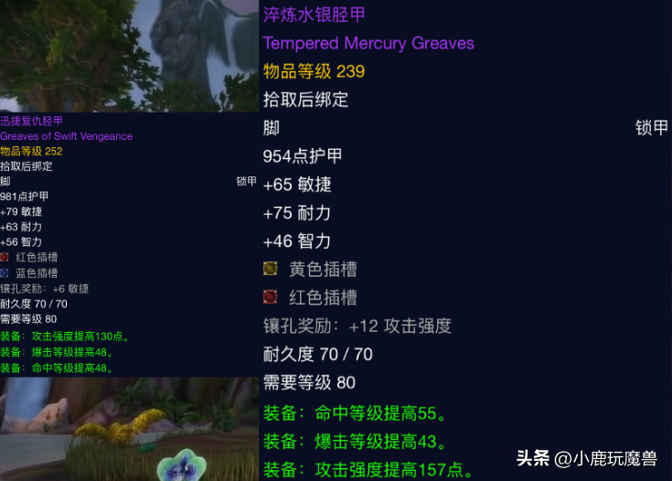 第九件:淬炼水银胫甲。这是一件超越装等的极品锁甲鞋子,我们来看看它的属性,白字加了65点的敏捷和75的耐力以及46点的智力,对于猎人来说这是三系开花,随后孩给到了一黄一红两个宝石孔,绿字属性则是55点命中和43点暴击以及杵到顶的157攻强,绿字属性也是可以说三系开花,这属性是不是看起来比252装等的锁甲鞋子好多了,小鹿也有点奇怪,属性比252的鞋子更多一些。