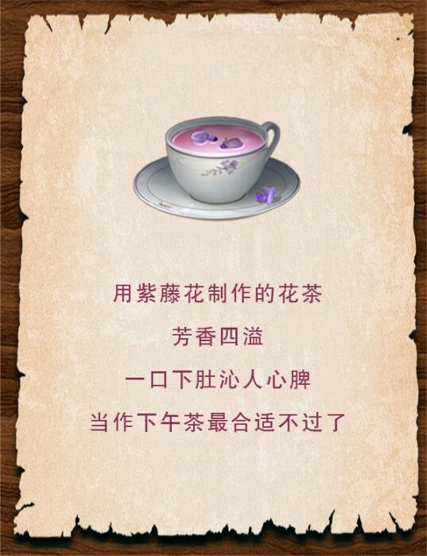 食用效果:饮用紫藤花茶不仅可以提升10%移速,还能提升10%对污染生物伤害,持续时间600秒。
