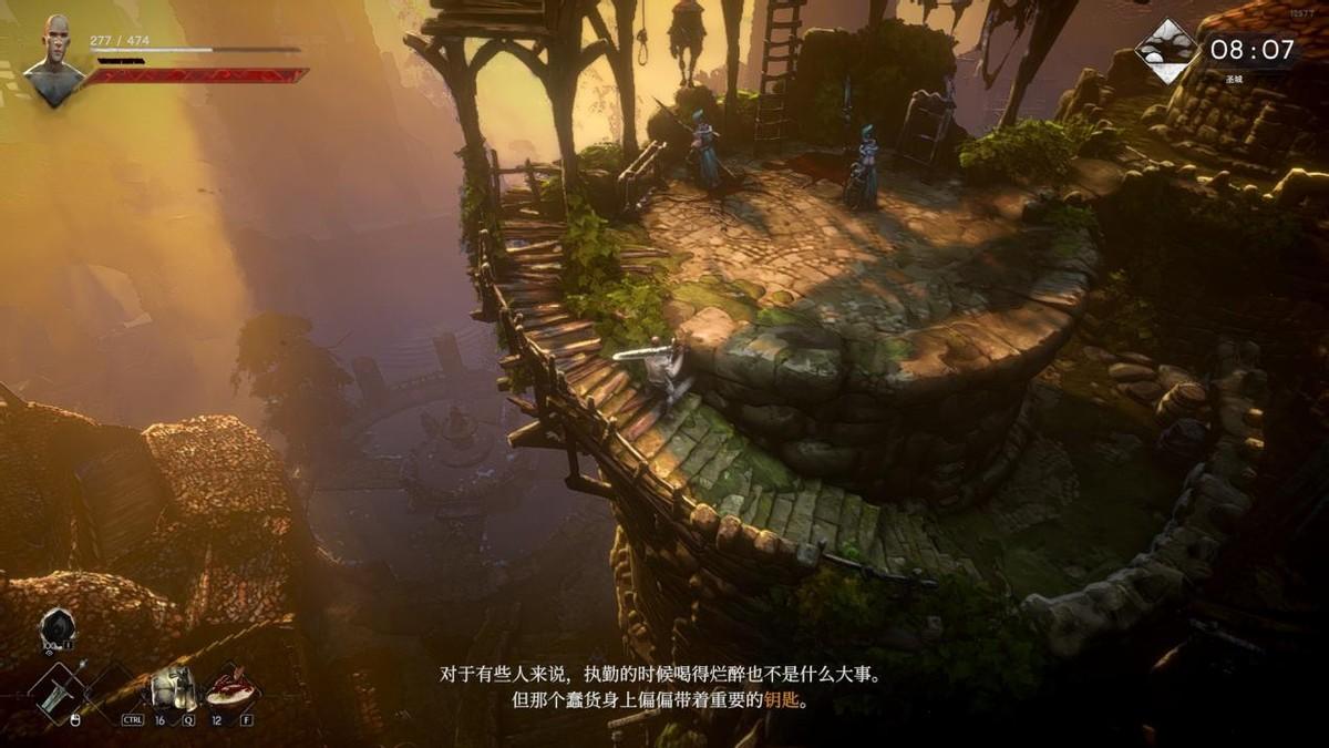 而在这巧夺天工般的美术功底背后,其镜头语言等等的各种软性指引也同样功不可没,譬如玩家需要解救一名囚犯继续推进剧情,而他需要你找一把钥匙,正当你苦恼万分时,便会听到守卫在一旁的高台上低语,顺着守卫的声音向上爬,直到玩家真的站上架子上,摄像机将视角抬高,守卫言语中的“喷泉”便从迷雾中现身,在玩家的视野中占据中心位置,并在这份光影之下显得格外显眼,所有的答案此刻都不言自明,玩家便会立刻从莫名其妙的任务中得到线索,从而拨云见日。
