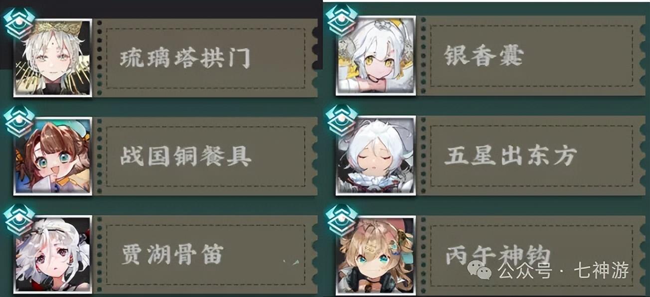第一关敌方的阵容如下:琉璃塔拱门(肉的离谱)、战国铜餐具(没头苍蝇)、贾湖骨笛(清debuff奶)、银香囊(增伤奶)、五星出东方(输出核心)、丙午神钩(副C)