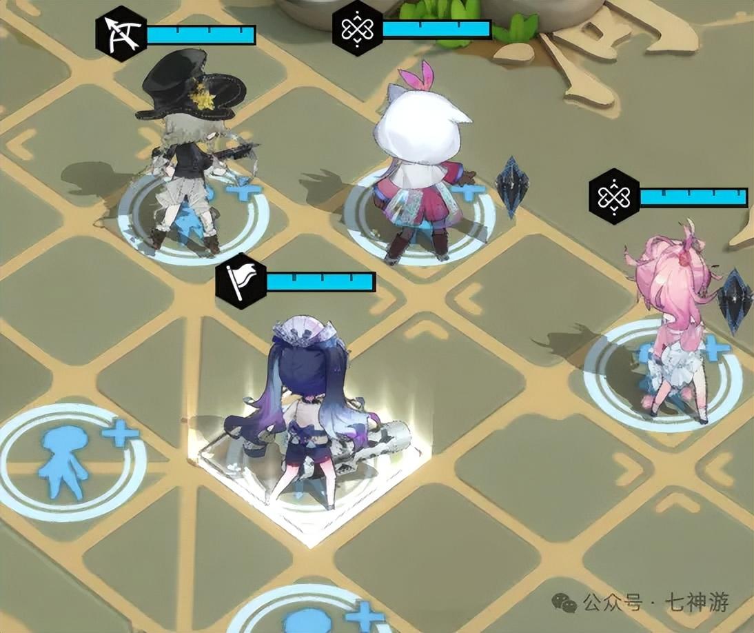 开局这样站位,方便蹭能量。第一回合果树开警戒,其他人都在极限距离蹭能量。