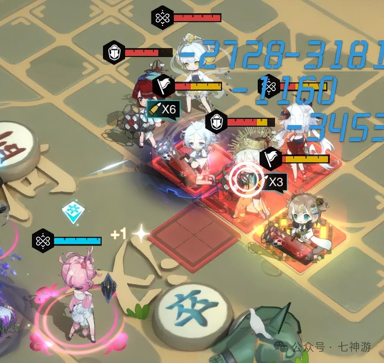 第三回合开始,玉琮王走上去A对面满能量的蝠桃瓶,然后我方蝠桃瓶开大处理掉对面蝠桃瓶,此时七盘舞砖不是走到了外面就是已经被警戒攻击打掉,如果走到了外面她的位置是可能被蝠桃瓶大招波及到的,就顺便了,波及不到就白釉绿彩瓶去补刀。宝石冠和舞蹈陶瓶处理掉上阳台帖,此处可以凹暴击但大概率不暴击也能打掉了。然后剩下两个宿卫不足为惧,轻松通关。