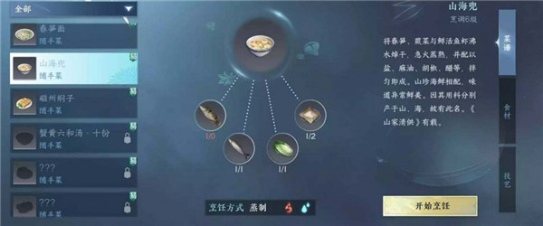 山海兜需要使用 二级河鲜*1+一级河鲜*1+蔬果*1+佐料*1 通过蒸制(火+水)而成,需要烹饪6级
