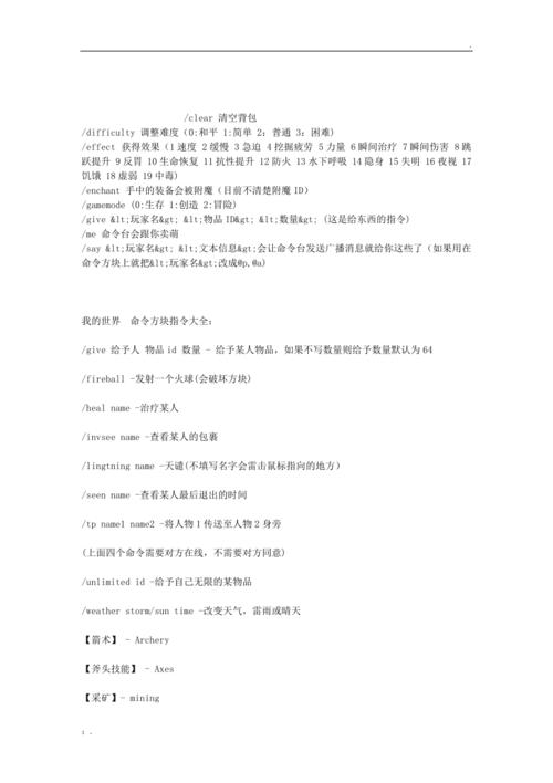 指令名称: 比如 /tp 是传送指令, /give 是给予指令, /summon 是召唤指令等等。