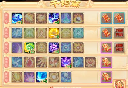 4、天策符:天策府是镶嵌在天策演上的,随着天策演等级提升会镶嵌更多的天策府,天策演有三个界面分别为千钧篇载物篇和御兽篇,顾名思义,千钧篇为提升本种族法术,重中之重,载物篇提高角色抗性,御兽篇是对召唤兽进行强化。